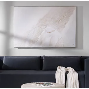 Evocative of marble and the moon, one can decide what this work of art depicts while styling within the interior. The soothing, heavy textured hand-painted print is optimal for a bedroom space where creating a calm atmosphere is key. A thin champagne/silver frame corresponds idyllically with the gray palette of the piece.