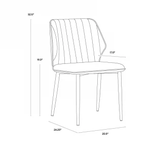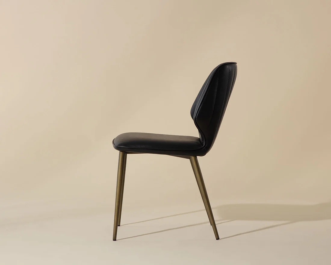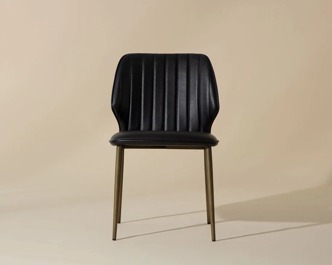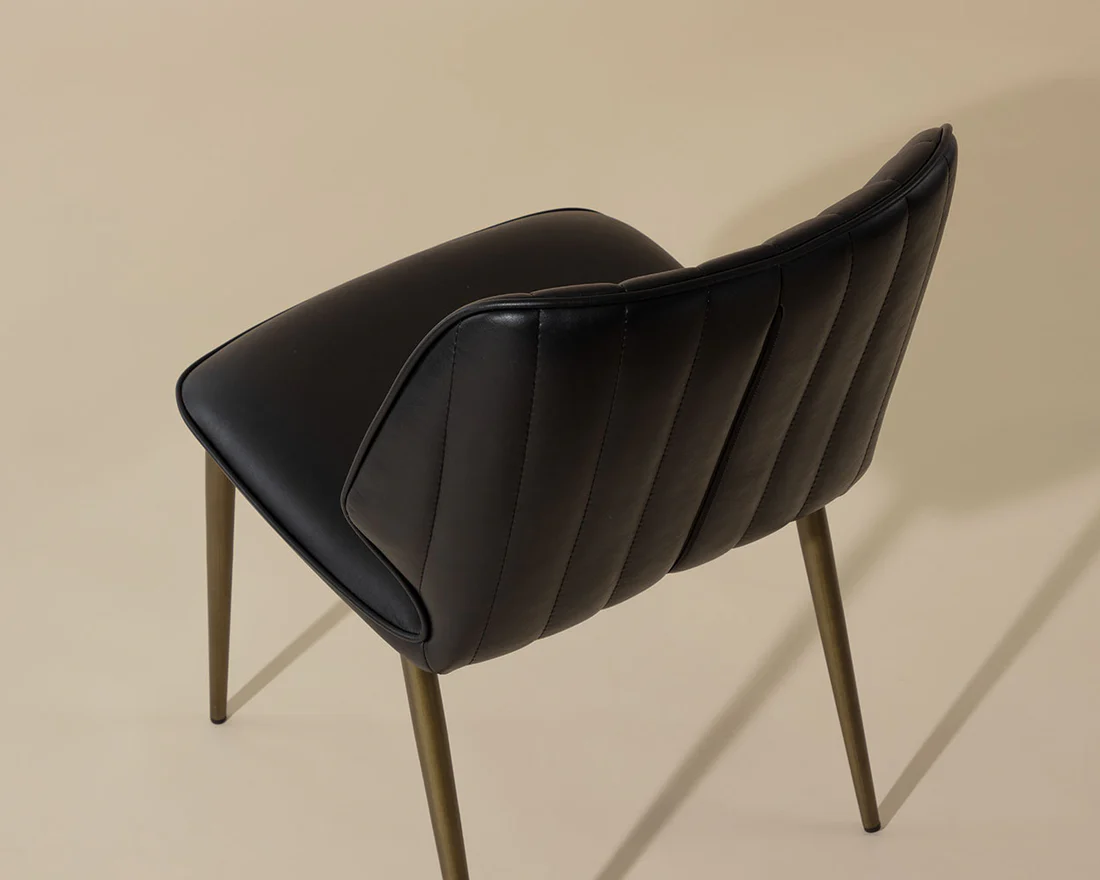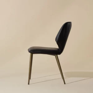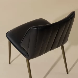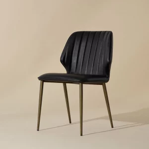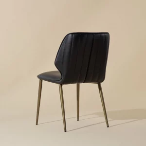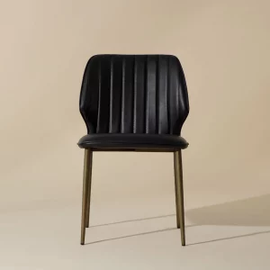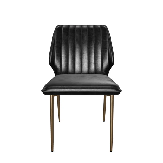 This industrial inspired dining chair is perfect for dining, lounge, office spaces and more. For a feminine touch, this design combines bravo black faux leather with channel tufting and bronze iron legs. Beautiful from all angles